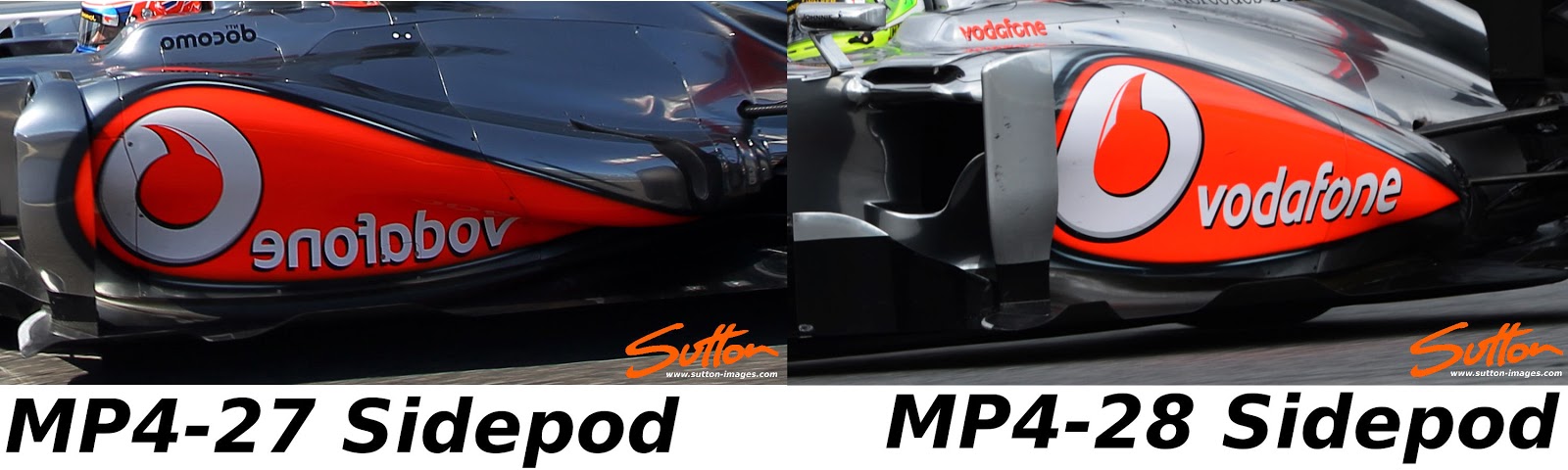Above: As we can see from the side by side comparison the rearward slope of the Sidepod has been altered on the MP4-28 whilst the more drastic rearward undercut has been reduced significantly
